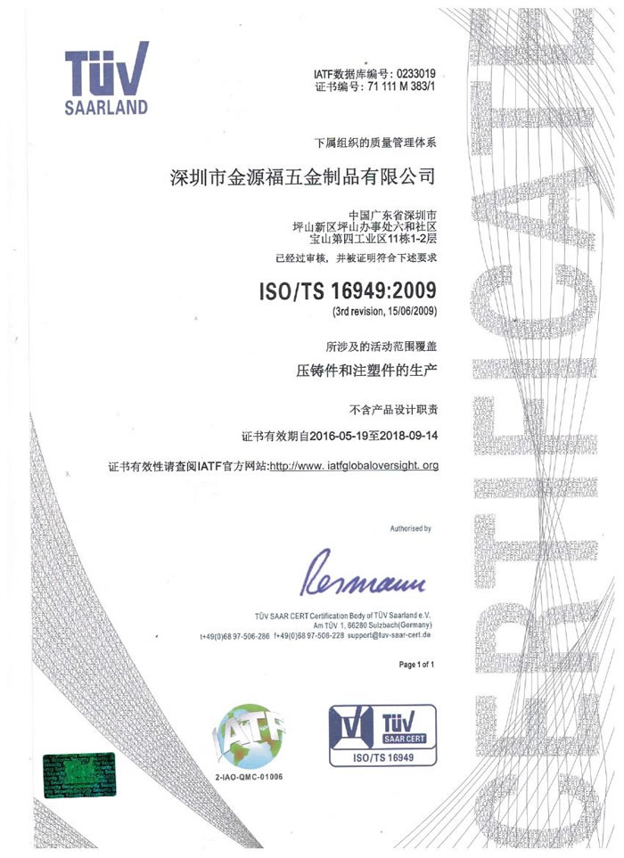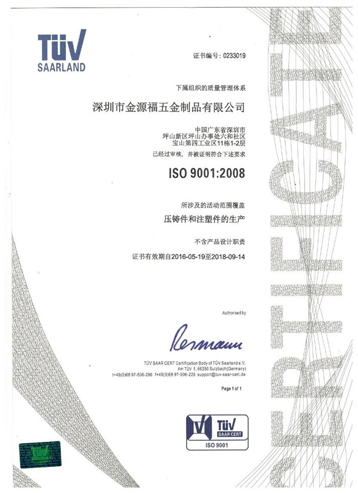 深圳市金源福五金制品有限公司成立于2003年。公司擁有8000多平方米生產廠地、開發(fā)與管理精英人才、技術專業(yè)、設備精良、交通便利、服務周全、具體設計、開發(fā)、制模、出樣、生產到成品出貨一體化模式生產廠家。已通過ISO9001:2008ISO1440/TS16949:2009國際質量體系認證。專業(yè)生產鋅合金壓鑄、鋁合金壓鑄產品、汽車配件、汽車后視鏡支架、車載導航散熱器、LED散熱器、LED燈罩、數(shù)碼電子五金結構件、家具五金裝飾件、標牌(LOGO)等五金壓鑄產品。